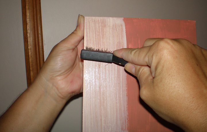 Depois pegue a escova e passe com pressão sobre a pintura, seguindo sempre o mesmo sentido, passe a escova bem rápido. E se a superfície for grande, não pare na metade pra não marcar, passe a escova por inteiro.