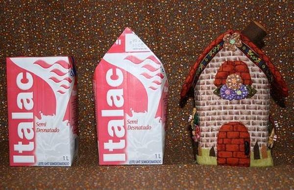Uma caixa de leite pode ser decorada de várias maneiras para virar um peso de porta.