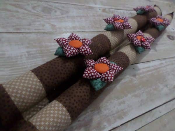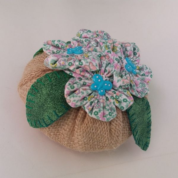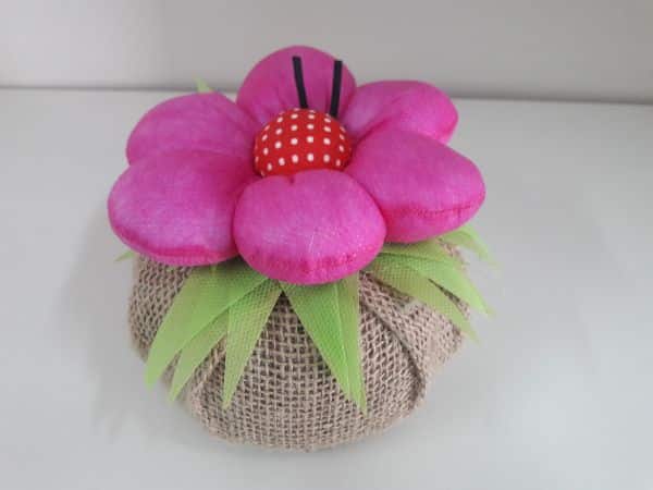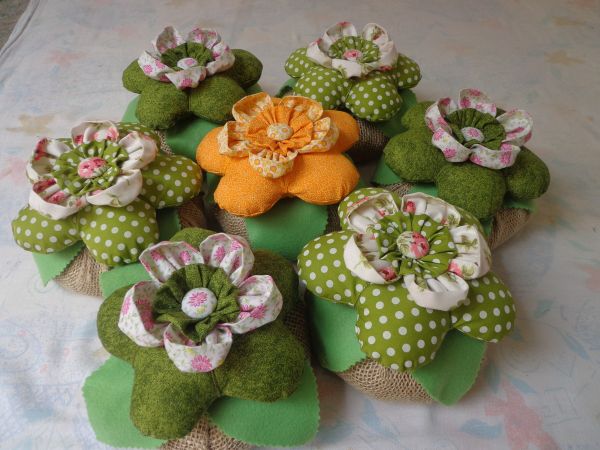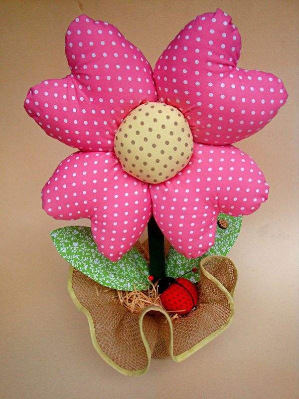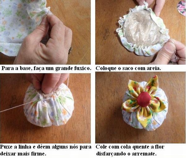 Faça um fuxico grande, encha com areia, feche e cole uma flor de fuxico como acabamento.