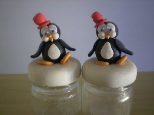 5. Faça uma touca para decorar o pinguim, faça com uma cor vibrante, azul, vermelho ou amarelo. Assim o seu pinguim vai ter um belo destaque. Para fazer a touca faça uma bolinha e depois achata e inclua na parte de cima do pinguim.