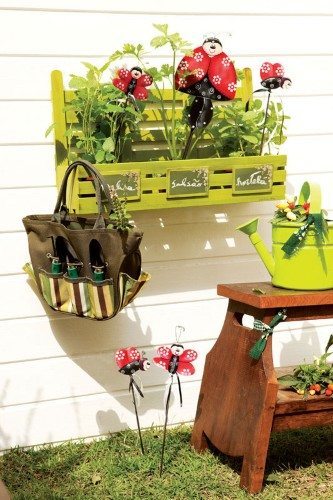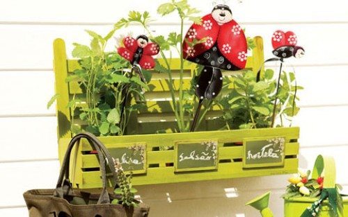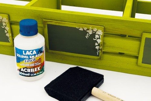 1. Use o pincel mousse para pintar as peças que vão dar destaque na jardineira (plaquinhas) com duas demãos de tinta verde-pistache .