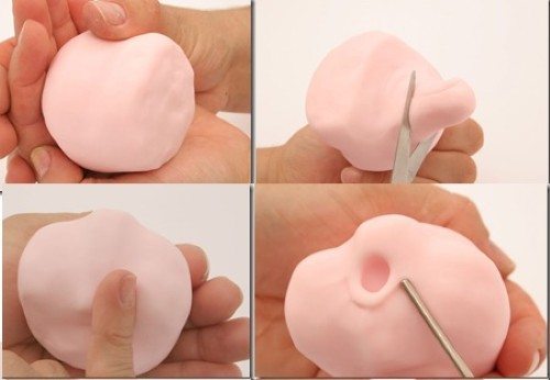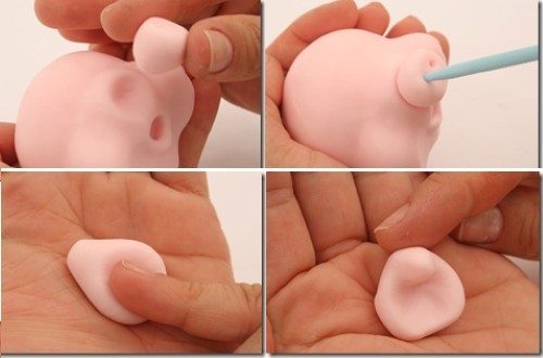 Faça uma cavidade utilizando o boleador. Faça uma bolinha e achate para formar o nariz e faça dois furinhos. Agora faça a orelha com duas bolinhas em formato de coxinha achatada.