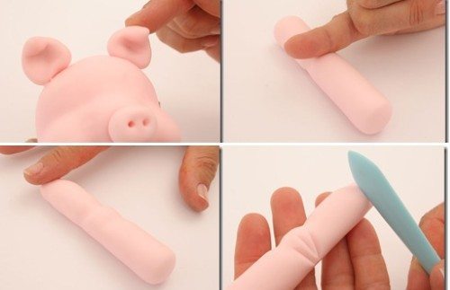 Use uma massa cor de rosa ou pinte a massa com a tinta cor de rosa. Cubra uma bolinha de isopor com essa massa, alongue a massa para cima e remova o excesso. Com o dedo marque a região dos olhos, do pescoço e as bochechas.