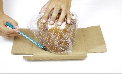 - Use uma fita métrica para marcar 1,5 cm a mais na circunferência para ter espaço para moldar a embalagem. Quem não tiver papelão pode substituir a base por isopor.