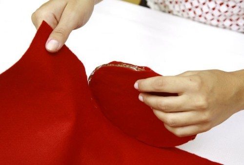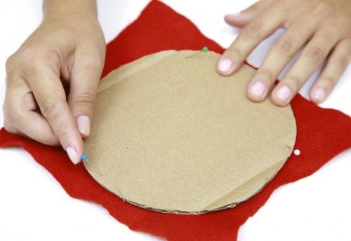 - Recorte um quadrado no feltro vermelho maior que o circulo elaborado para a base e prenda ele no molde com a ajuda de alfinetes e remova o excesso de feltro nas laterais. Faça novamente o mesmo procedimento em outra parte, para forrar o papelão dos dois lados. Use cola quente para unir o feltro ao papelão. Cole do centro para fora, para evitar que forme rugas.