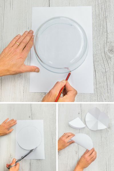 Comece desenhando o círculo no papel. Recorte ao final. E dobre várias vezes, para formar oito partes.