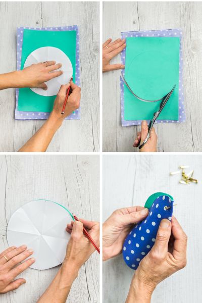 Logo após, transfira o molde feito sobre o EVA já revestido com o tecido. E marque no EVA onde fica cada dobra do tecido. Depois dobre em uma das marcações, com o tecido do círculo para fora, fure e fixe uma tachinha.