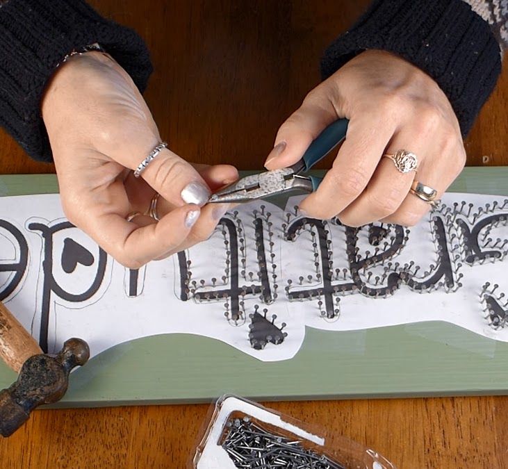 Com o auxílio do martelo, fixe os pregos pequenos ao redor do contorno da palavra ou do desenho escolhido.