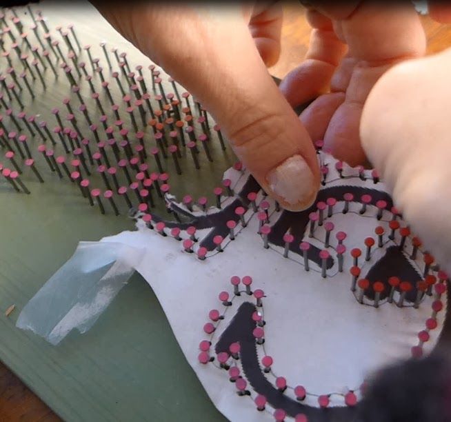Escolha a primeira linha que você vai utilizar e comece a passar pelos pregos, criando movimentos ou formatos de sua preferência com este fio.