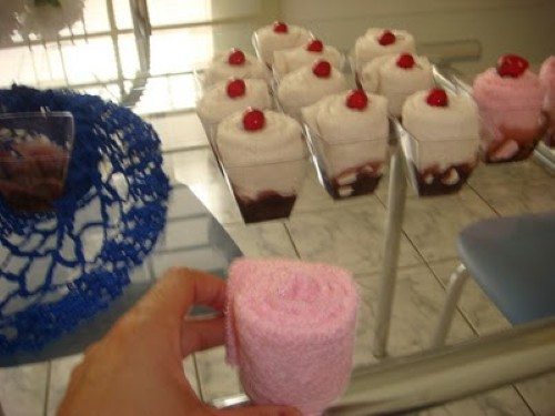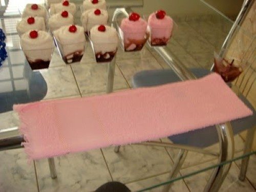 A toalha deve estar dessa forma, como na imagem. Em seguida coloque a toalha dentro do copinho. Compre a toalha do tamanho que correspondente ao copo.
