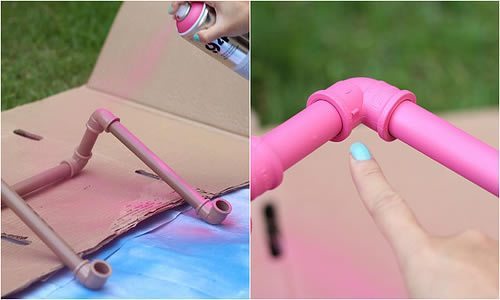 Agora você irá dar cor a sua arte! Vá para uma área externa bem ventilada e forre o chão para não melar tudo. Arranje também uma máscara protetora para o seu rosto. Depois cubra toda a superfície com a tinta Spray na cor desejada. Pinte bem as junções, onde os canos estão conectados.