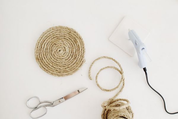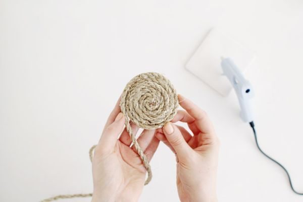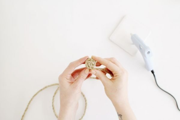 Comece enrolando a ponta da corda ao redor de seu próprio eixo, e colando a ponta e também as voltas da corda com o auxílio da pistola de cola quente.