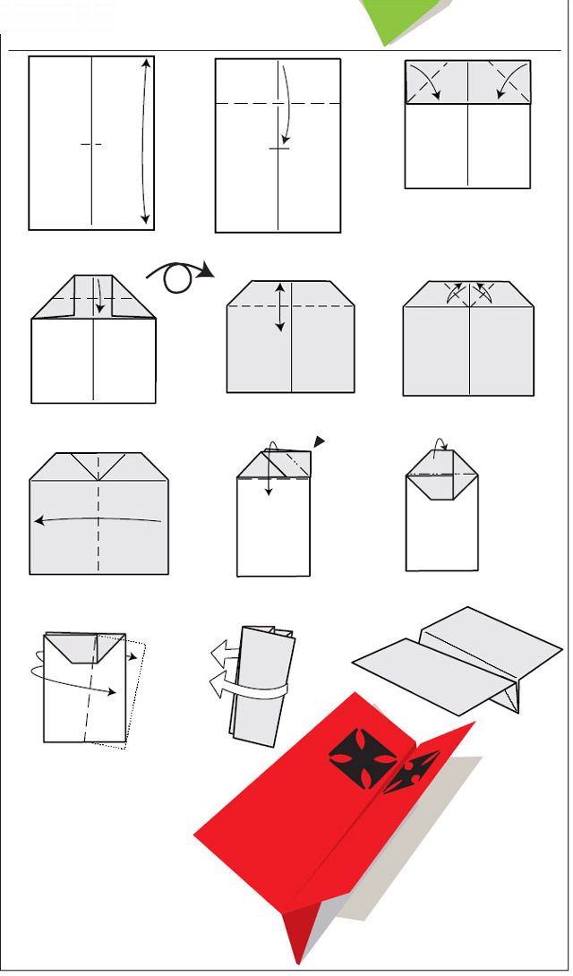 Dobre a ponta superior de um retângulo até o meio. Dobre os cantos superiores para dentro. Dobre a parte superior e vinque o meio. Dobre ao meio e dobre a pontinha. Coloque a parte interna para fora e dobre as asas.