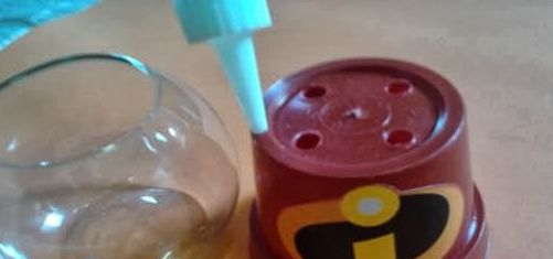 Para fazer este divertido baleiro você irá precisar de: 1 vasinho de plástico (com a cor de sua preferência ou com você pintando o vasinho com a cor que você precise para combinar com as cores do restante da decoração); 1 peça circular de vidro; silicone líquido; e adesivo com o tema da festa ou qualquer figura de sua preferência, que pode ser desenhada por você ou recortada de qualquer lugar.