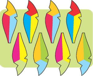 Pinte as penas com canetinha ou giz de cera seguindo a sequência de cores mostrada na imagem a seguir, e sempre pintando do centro para a parte de fora. E após pintar todas as penas, recorte-as com a tesoura.