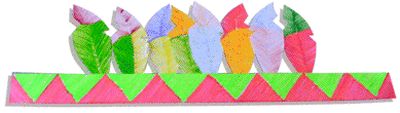 Para fazer a tira do cocar (que fica na cabeça), recorte na cartolina ou papel cartão uma tira com 5 cm de largura com 60 cm de comprimento. E pinte a tira fazendo ziguezague, e utilize cores bem intensas para pintar a tira do cocar.