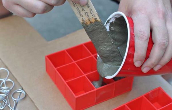Logo após, prepare a mistura de cimento como indicado na embalagem e depois despeje dentro da forminha de gelo, despejando um pouco em cada divisória.