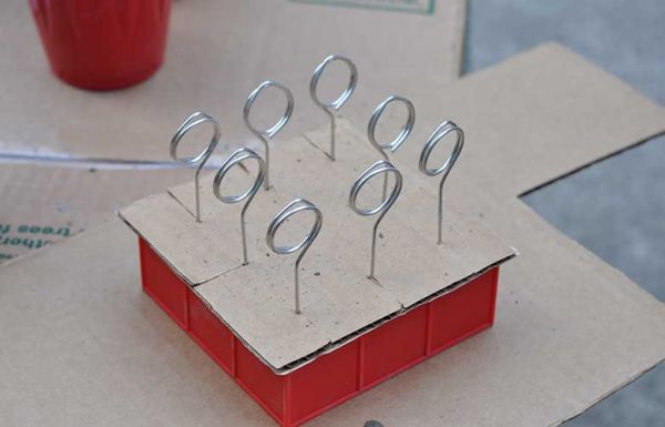 Agora, quando você tiver preenchido todos os espaços da sua forminha de gelo posicione o pedaço de papelão sobre a forminha e posicione os porta-recados de arame em cada divisória da sua forminha de gelo. E deixe o cimento secar muito bem antes de manusear novamente a sua peça e continuar com a confecção de seu trabalho.