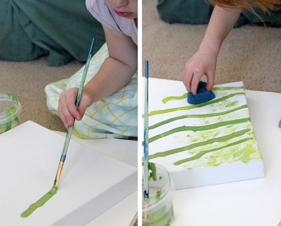 Logo após, pinte a tela, com o auxílio do pincel e também da esponja para limpeza, para que você ou a sua criança crie um cenário com caules e céu azul, para acomodar as suas flores.