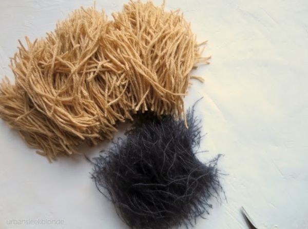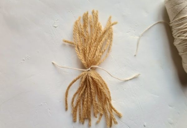 Agora, pegue alguns fios de lã e amarre no meio com um pedaço de fio de linha para costura ou de linha para crochê com cor combinando, e fazendo dois nós, para ficar bem firme.