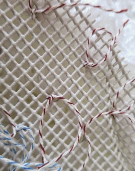 Em seguida, comece a amarrar estes “pompons” estilizados que você criou na tela para tapete ou na juta com tramas largas, fazendo também dois nós em cada amarração, para ficar firme.