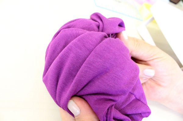 Logo após, para finalizar a sua peça, usando a abertura restante, vire o turbante todo pelo avesso mais uma vez. E faça um acabamento à mão, com pontos invisíveis na fenda que ficou atrás do turbante. E está pronto!