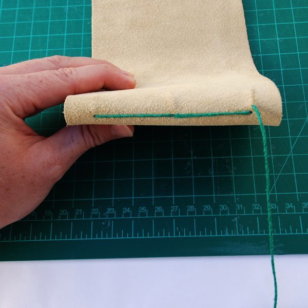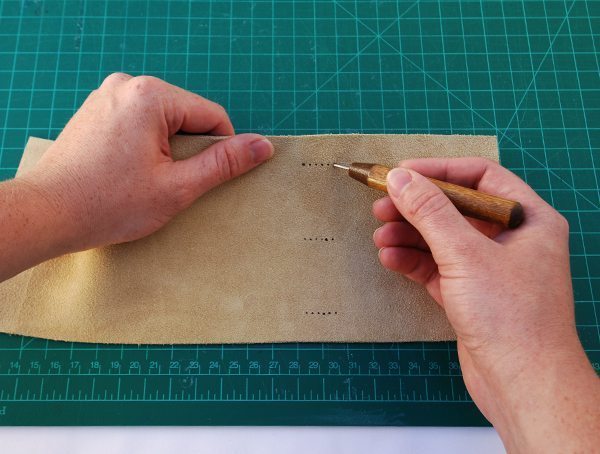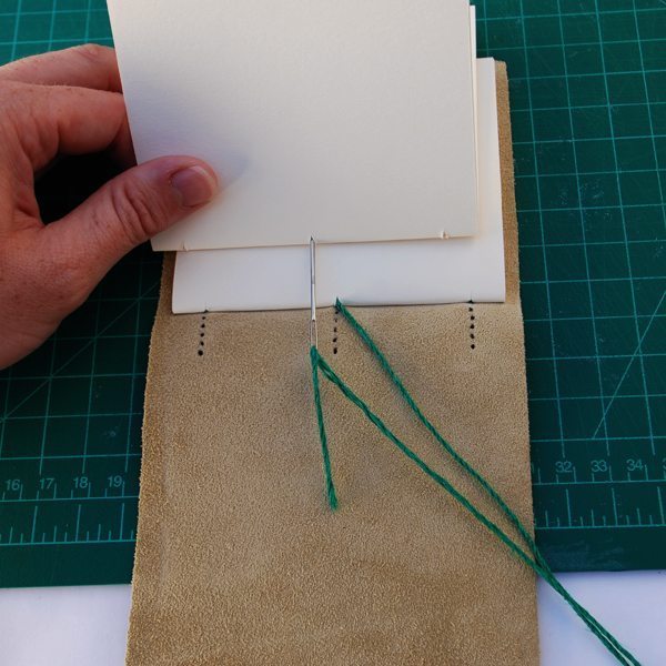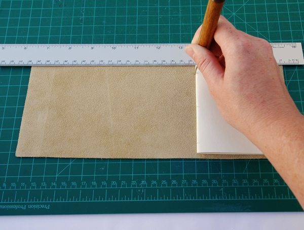 Agora, corte o couro ou a camurça com um tamanho um pouco maior que as folhas de papel dobradas, com sobra para a aba, e marque onde você deverá furar. Lembrando que você deve fazer a quantidade de fileiras de furos correspondente à quantidade de grupos de folha de papel dobradas.