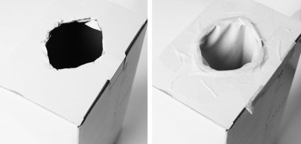 Comece fazendo um furo na parte de cima de sua caixa de papelão, mas com tamanho suficiente que permita fixar a borda da sua luva de borracha. Depois fixe a borda da luva de borracha escolhida no furo feito na caixa de papelão, com o auxílio da fita adesiva larga. E coloque muitos pedaços de fita adesiva, para que a luva fique bem firme no lugar e não se solte quando você prosseguir com o seu artesanato.