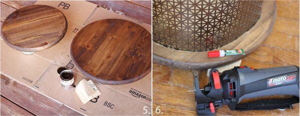 Em seguida, pinte as placas redondas de madeira com a tinta de sua preferência ou com um verniz com tonalidade de sua preferência. E quando a placa de madeira estiver bem seca, cole nela o cilindro de alumínio, com auxílio de uma cola bem resistente.