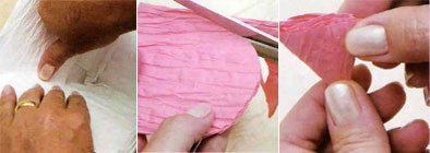Abra o fio Kraft verde e em seguida corte um pedaço de 10 cm. Agora dobre-o ao meio e utilizando a tesoura você irá fazer bicos em forma de “V”. Fazendo uso de suas mãos, você franzi a base.