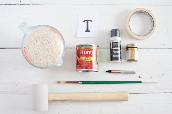 Em seguida, lave muito bem a lata, retire o rótulo, encha a lata com arroz e água e leve ao congelador, até congelar totalmente a sua lata. O arroz com água vai virar gelo e facilitar o momento de você transferir o desenho para a sua lata.