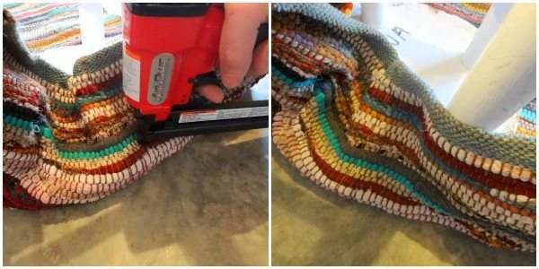 Comece a fixar o tapete fino no assento do seu banquinho, com o auxílio do grampeador para tapeceiro ou com o auxílio de preguinhos bem pequenos sendo fixados com o martelo.