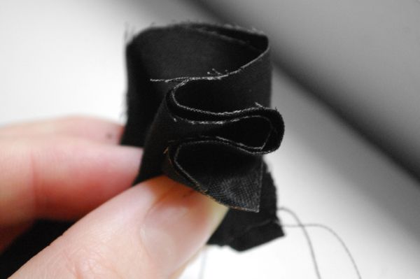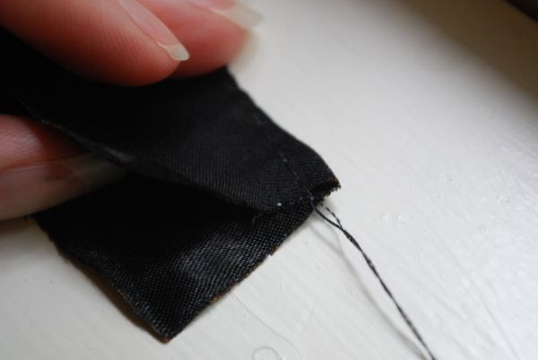 Agora, puxe a linha do pesponto, franzindo toda a tira do tecido, formando movimentos sinuosos na outra extremidade, a que está oposta à dobra do tecido.