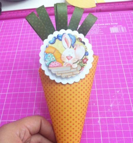Para fazer este simpático cone em formato de cenoura você irá precisar de: papel de scrapbook laranja (ou com estampa laranja); papel de scrapbook verde (ou também com estampa verde); furador circular extragigante (2 tamanhos diferentes); papel com tema de Páscoa; papel branco; cola branca comum; fita banana; e fita dupla face.