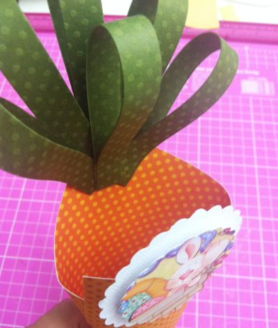 Para finalizar basta colar este detalhe feito de papel na borda do cone, mas na outra extremidade de onde estão as tiras verdes. E está pronto! Agora, basta encher com bombons.