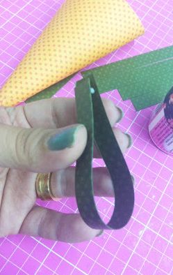 Agora, corte as tiras verdes ao meio e aplique cola apenas em uma das pontas. “Feche” a tira e segure alguns segundos para a cola fixar muito bem. E faça isso com todas as tiras.