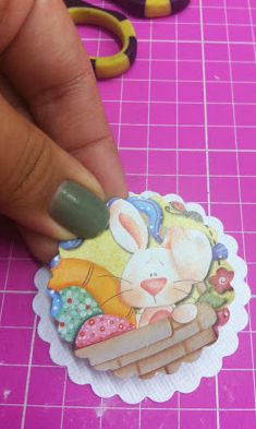 Logo após, utilize os furadores circular extragigantes no papel com o tema da Páscoa e no papel branco. E quando terminar, coloque um pedaço de fita banana entre os dois círculos de papéis.