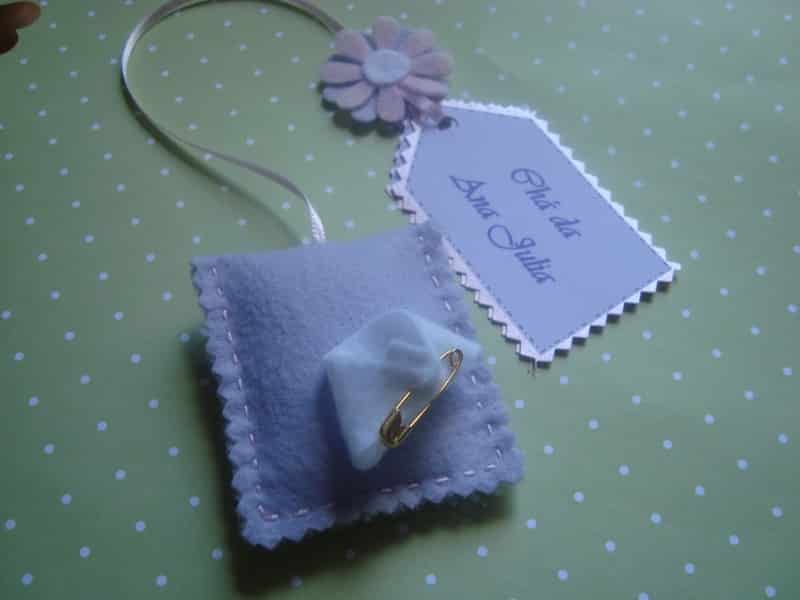 Corte um triângulo em um EVA, podendo ser com uma tesoura para picotar. Coloque no meio um pedaço de papel com os dados da festinha. Dobre uma ponta lateral sobre a outra e o bico inferior sobre tudo. Prenda com alfinete de segurança. O papel do meio pode também ser colado sobre um pedaço de EVA com picotes nas bordas.