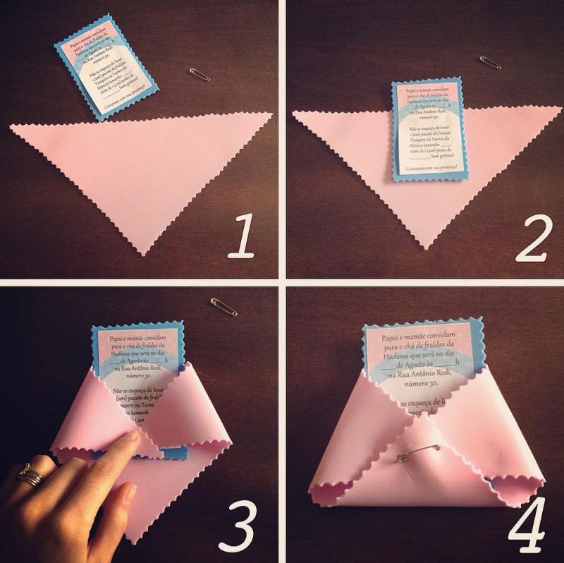 Você pode usar a sua criatividade ao extremo quando for confeccionar um convite para o seu chá de fraldas.