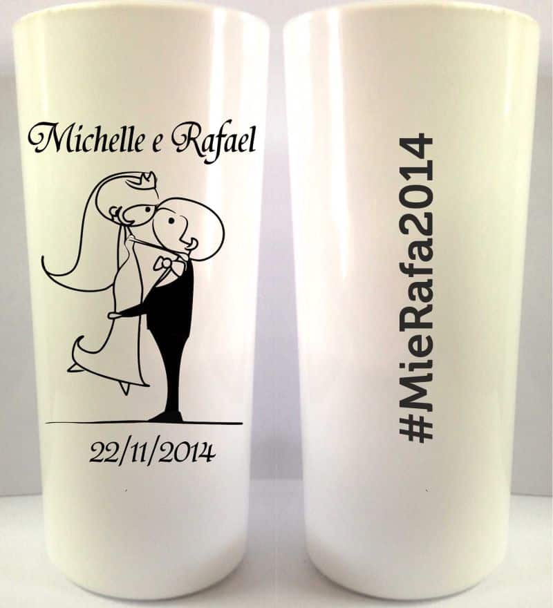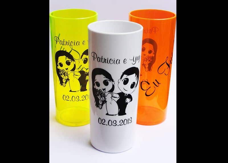 Para os casamentos os copos de acrílico podem ser personalizados com os nomes dos noivos, data do casamento e até com uma linda mensagem para os convidados. Noivos criativos podem optar por copos divertidos.