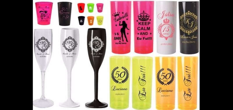 Festas em geral podem ter copos personalizados de acrílico. O formato do copo pode ser bem diverso, indo desde o copinho tradicional até formatos de taça ou de caneca. Mensagens podem ser escritas os copos, além de dados da festa, como nome do aniversariante ou formando, data do evento e outros detalhes sobre a comemoração.