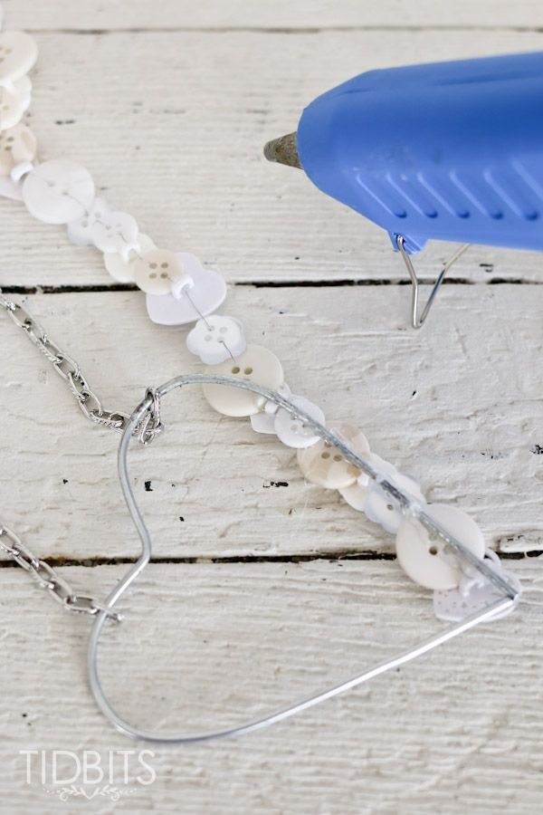 Comece a colar o seu cordão de botões feito anteriormente sobre o seu coração de arame, com o auxílio da pistola de cola quente. Comece a colar pela ponta inferior do coração.