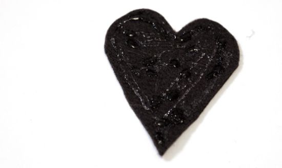 Em seguida, você deve aplicar um pouco de cola quente, com o auxílio da pistola de cola quente, em todo o coração recortado no tecido.