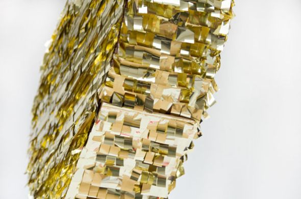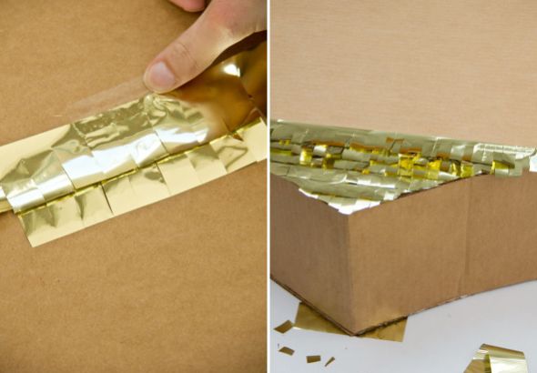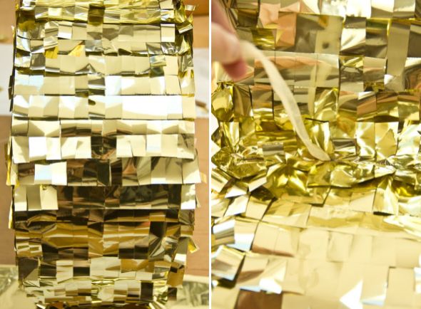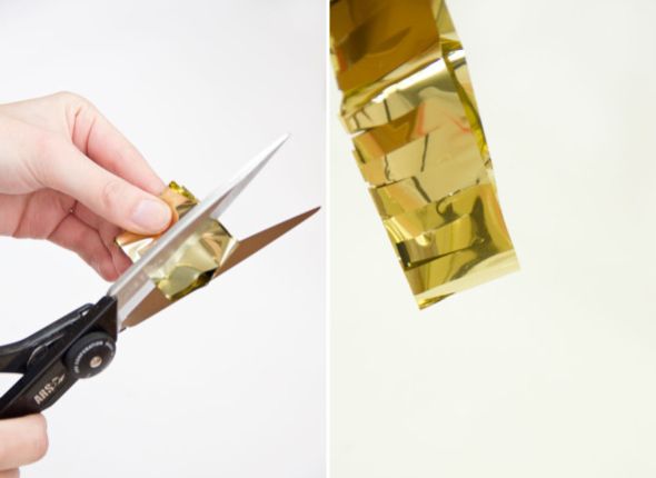 Agora, corte várias tiras no papel laminado dourado ou no papel metálico dourado. Dobre estas tiras algumas vezes e corte um dos lados, para fazer uma franja.