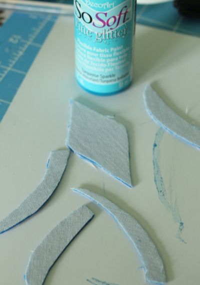 Logo após, pinte os detalhes de sua coroa com a tinta para tecido turquesa e o auxílio de um pincel limpo. E jogue glitter enquanto a tinta ainda está úmida.