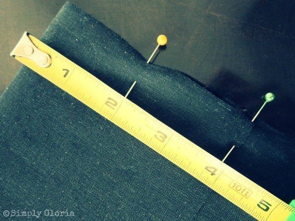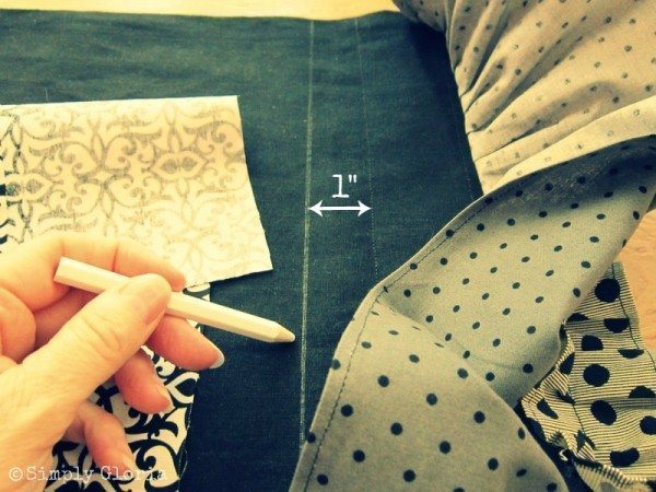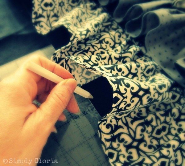 Agora, marque, com o auxílio do giz ou lápis para costura, onde você deverá costurar o primeiro babado de sua cortina. E então posicione o primeiro babado e costure-o na base de sua cortina, mas erguendo o primeiro babado que foi costurado anteriormente em sua cortina.