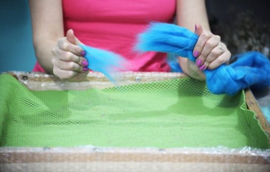 Para fazer esta colorida cortina você irá precisar de: lã Merino em mecha (com as cores de sua preferência, e encontradas facilmente em armarinhos); fio de nylon; sabão de oliva; plástico bolha; tela antiderrapante; e agulha.