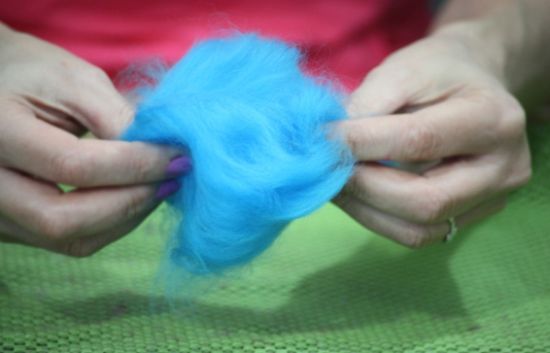 Em seguida, segure a mecha de lã Merino com uma das mãos e com a outra puxe delicadamente uma mecha menor.  E repita este movimento quatro vezes, concentrando as mechas sempre na mesma mão.