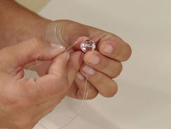 Em seguida, continue colocando as miçangas, mas sempre intercalando as cores e os tamanhos das miçangas e cristais, formando uma sequência bem interessante. E quando chegar ao final dê um nó para as pedras não escaparem. E repita o mesmo processo em cada um dos fios de nylon, até alcançar o número suficiente de fios para a sua cortina ficar com a largura desejada.