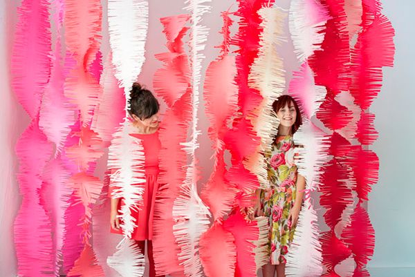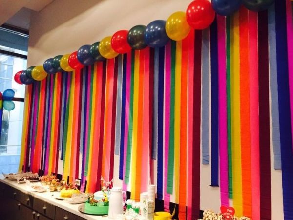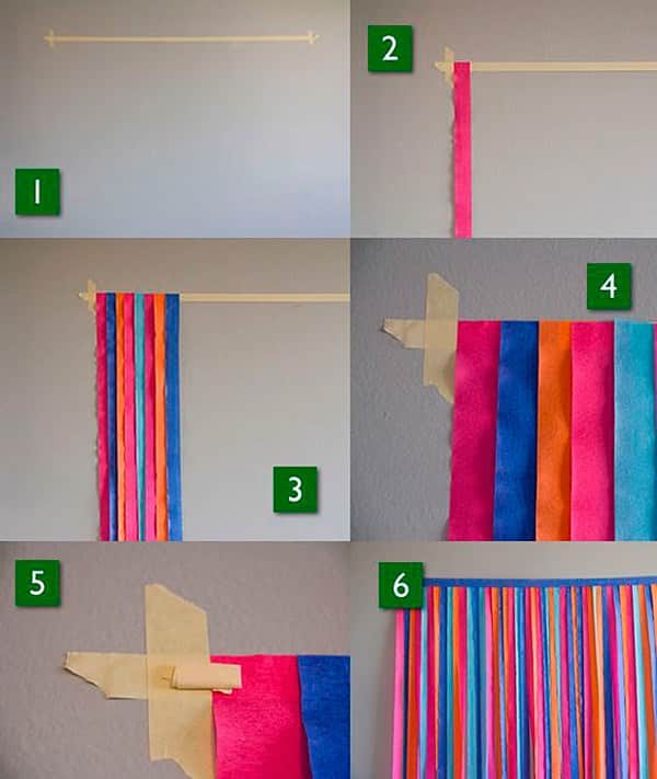 Com uma cortina de papel enrolado você vai diferenciar ainda mais todo o seu espaço. Cole na parede tiras de papel crepom. Depois, basta enrolar a tira de papel crepom e colar a outra ponta com fita adesiva. Você pode decorar a parte onde estão as pontas das tiras da maneira que desejar.
